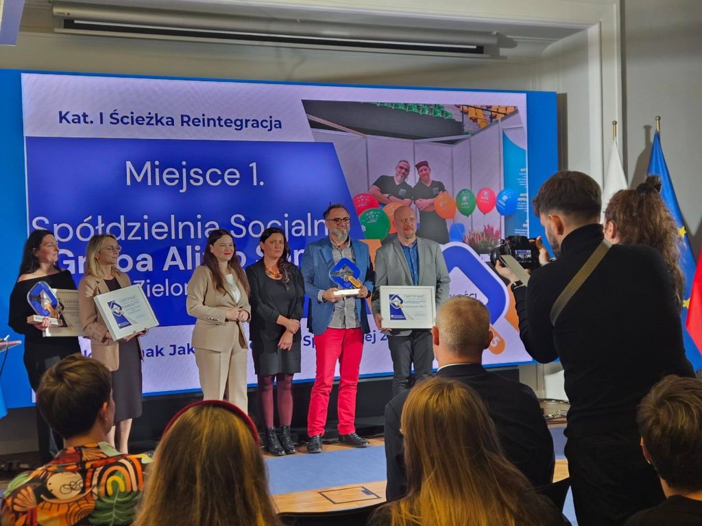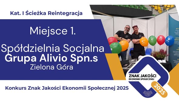 Z nieukrywaną dumą informujemy, że spółdzielnia socjalna Grupa Alivio Spn.s zdobyła pierwsze miejsce w kategorii Reintegracja w konkursie ZNAK JAKOŚCI EKONOMII SPOŁECZNEJ, którego organizatorem jest Ministerstwo Rodziny Pracy i Polityki Społecznej. Nagrodę z rąk Pani Ministry Katarzyny Nowakowskiej odebrał zarząd spółdzielni podczas uroczystej gali LAURY SPOŁECZNE, która odbyła się 13 listopada 2025 w Warszawie.